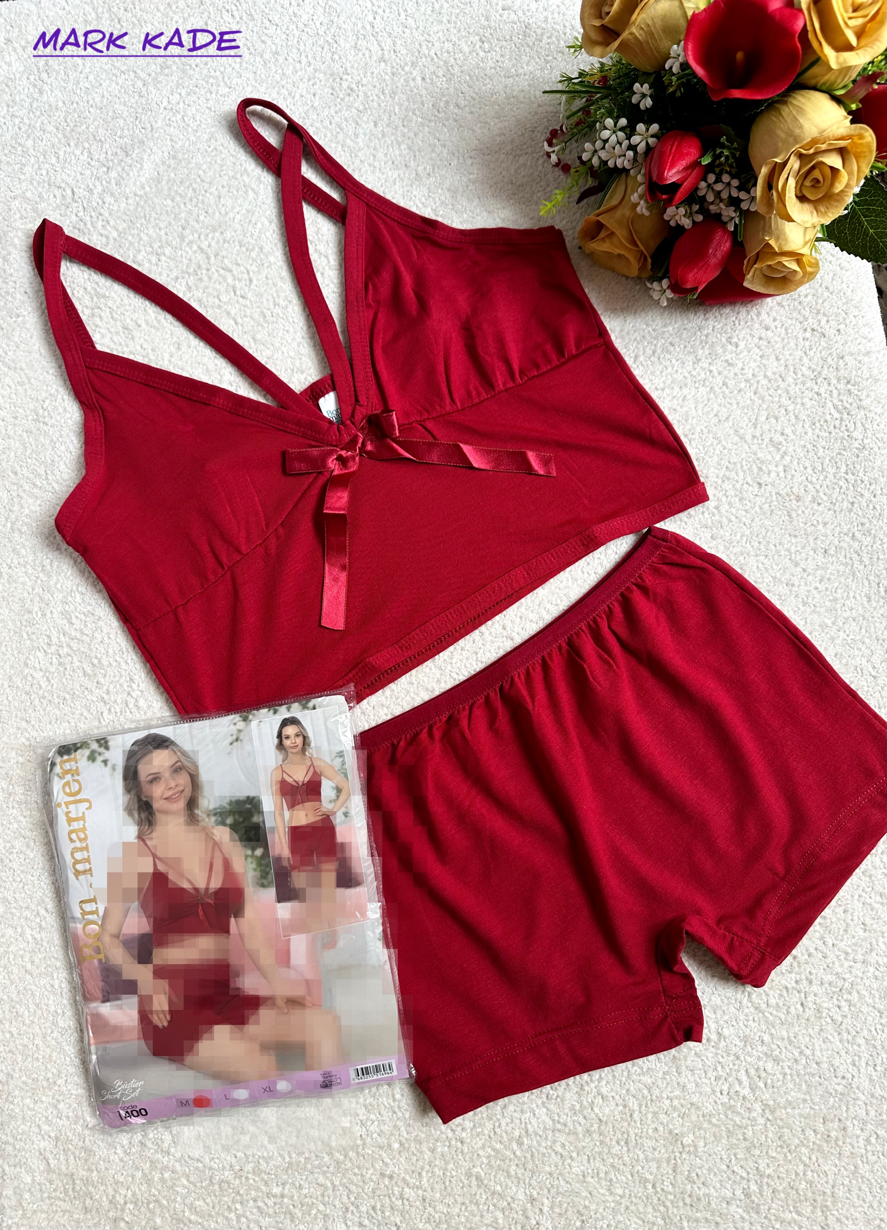 ست شورتک و نیم‌تنه زنانه نخی اورجینال Bonmarjen ترکیه – رنگ قرمز اناری
